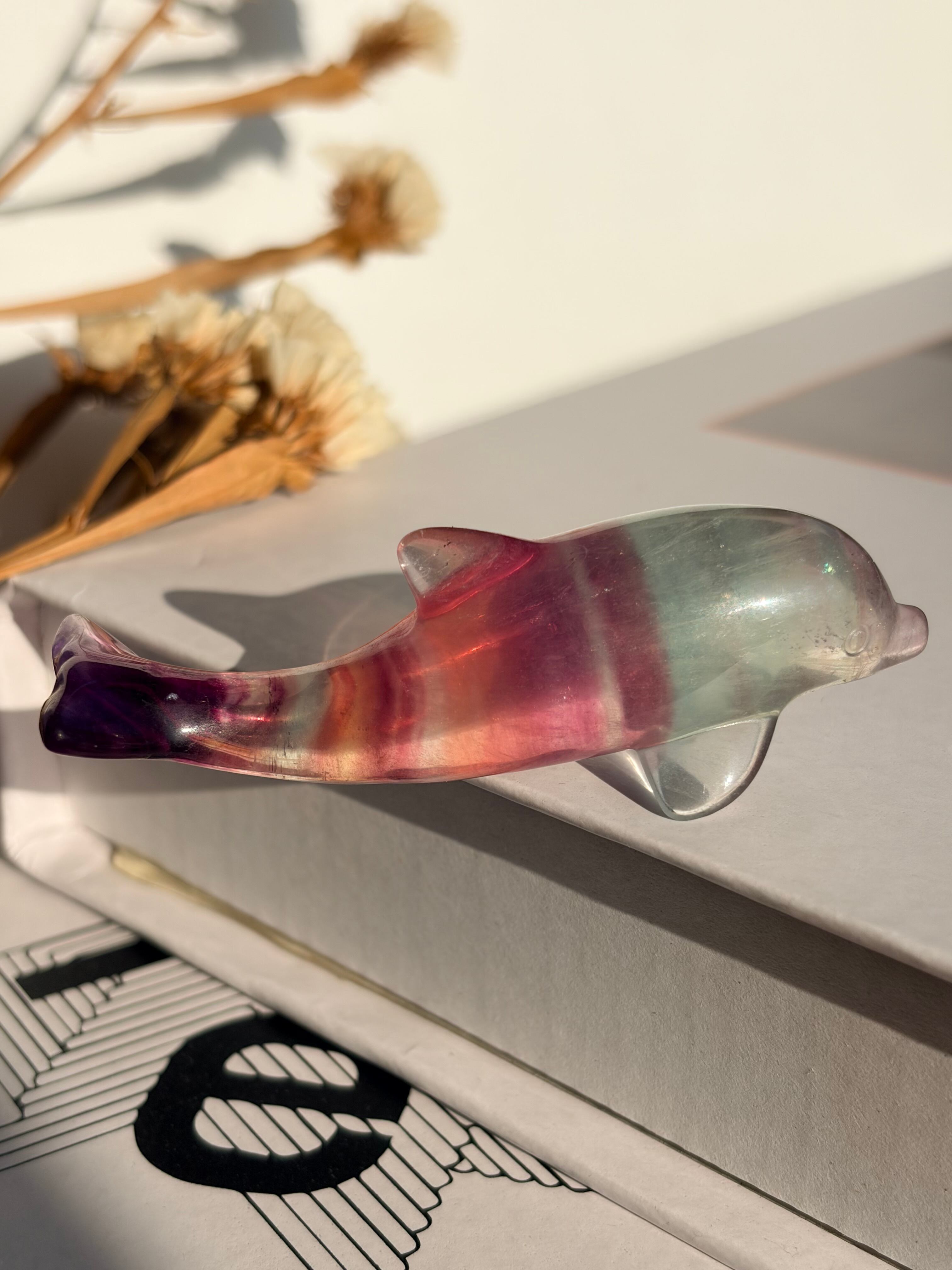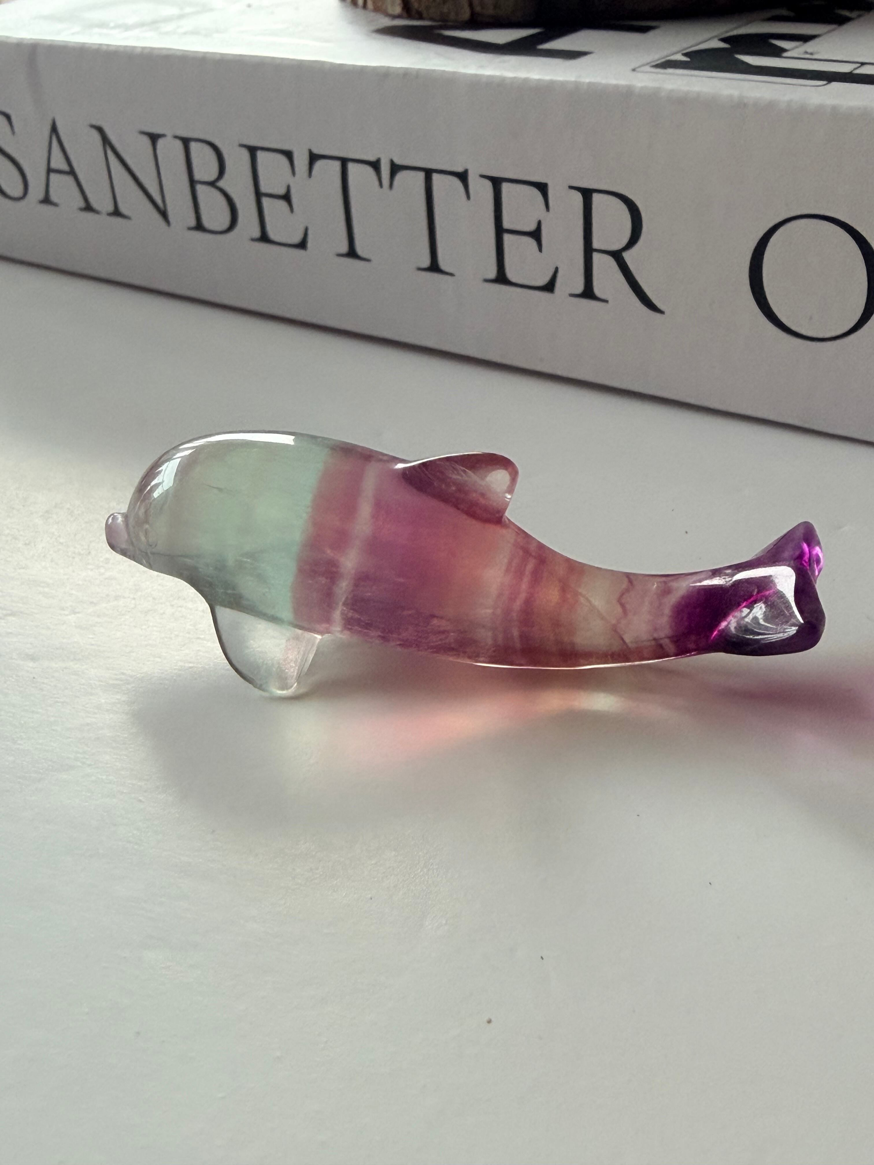 ちょこんと可愛らしいイルカのフォルムに、フローライト特有の透明感ときらきらした輝きが映える天然石カーヴィング。